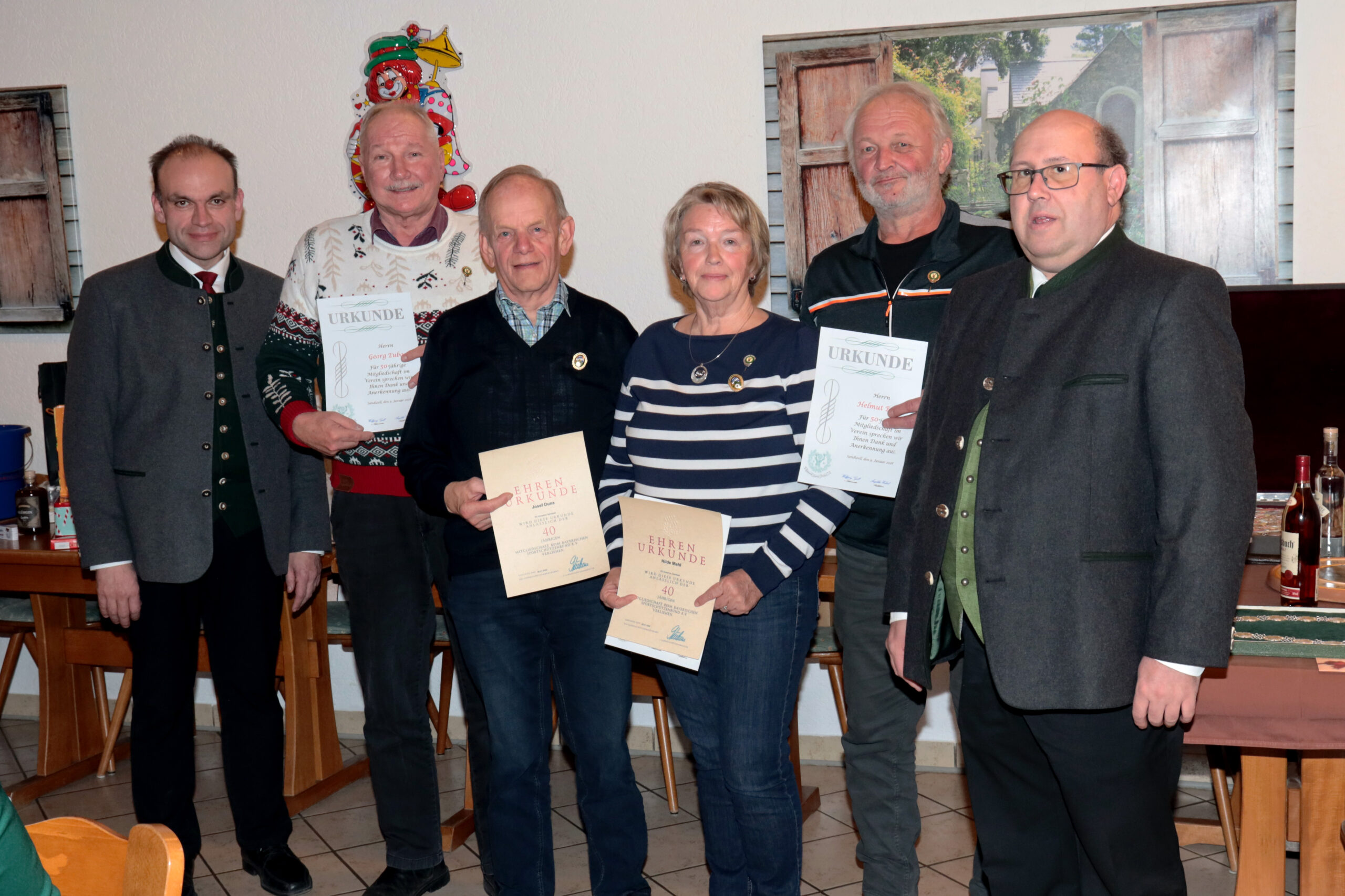 Auf der Generalversammlung von Hubertus Sandizell wurden von Gauschützenmeister Andreas Elbl und Schützenmeister Wolfgang Gall langjährige Mitglieder geehrt. Vlnr. Georg Euba 50.J, Josef Duna 40 J. Hilde Mahl 40. J, und Helmut Euba 50 J.